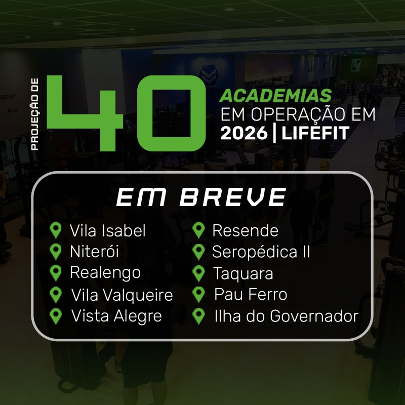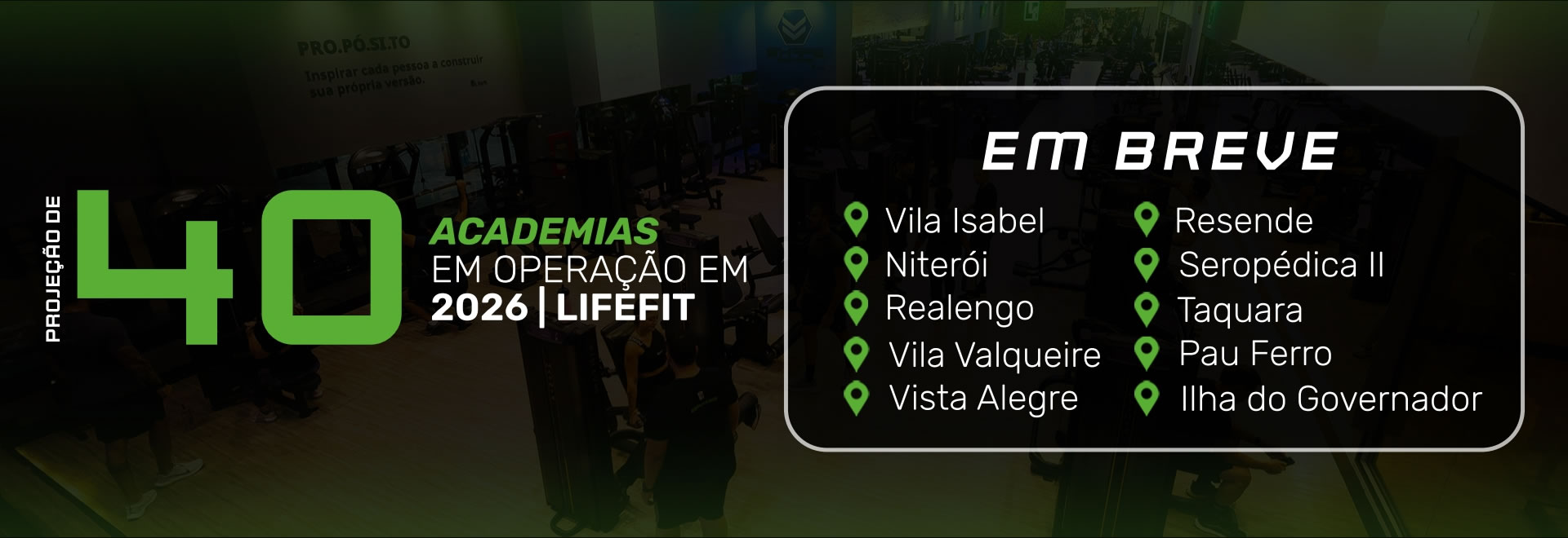 Na Lifefit, proporcionamos mais do que treinos – oferecemos uma experiência completa de saúde e bem-estar. Com estrutura de alta qualidade e uma equipe dedicada, nosso objetivo é ajudar você a atingir a sua melhor versão, sempre.